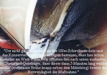 Bild unten links: "Im Reparaturleitfaden "Lackierung" steht, dass Teile mit mehr als 5mm Unterrostung zu ersetzen sind. Wir werden sehen, wie standhaft sich dieses 123er Abschlußblech nach der Lanolinbehandlung zeigt, die hier nicht in Konkurrenz zum Wachs tritt, denn dieses Teil wurde seinerzeit im Werk glatt vergessen!”